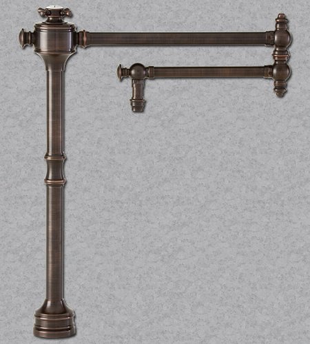 Tradtional Deck Mount Pot Filler Available with a cross or lever handle-please choose (see photo under specs for lever handle) Classic design to compliment all of the Traditional Suites (Annapolis, Hampton and Towson) 22” reach spout featuring a built-in check valve to prevent dripping ? turn ceramic disk valve cartridge and aerated water stream . Available in the following colors: Antique Brass, Antique Bronze, Chrome, Black-Oil Rubbed Bronze, Satin Chrome, Tuscan Brass, Weathered Brass, Almond, Gloss Black, Bisquit, Antique Copper, American Bronze, Antique Pewter, Carib